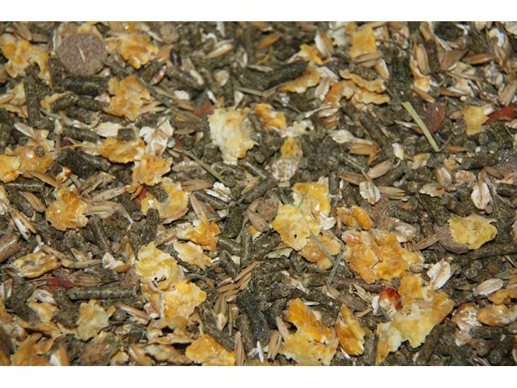 Blandingen består af kaninpiller, rabbit royal, hvalset havre, majsflager og senere kommer der også solsikkekerner i.