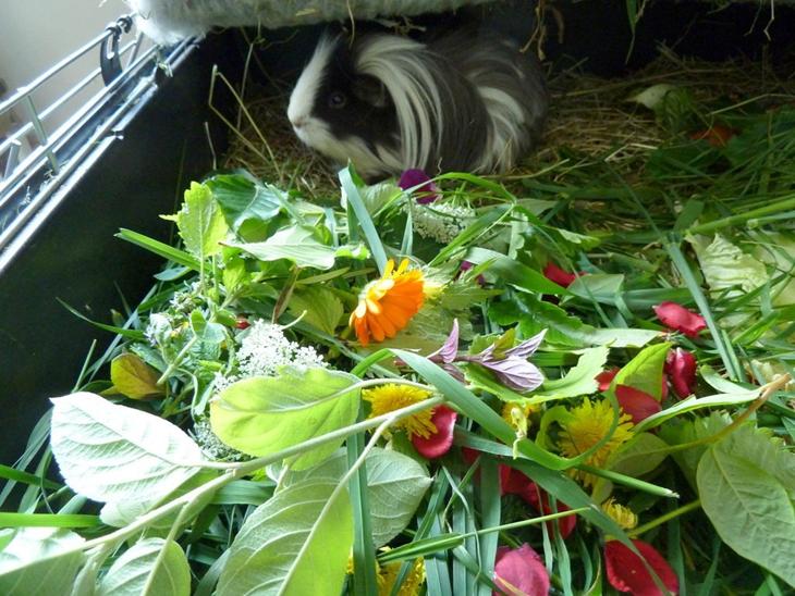 Sådan ser fodringen ud hjemme hos mig. Mine marsvin (som er cirka 5 år) får ikke tørfoder, men i stedt masser af grønt fra naturen suppleret med lidt købegrønt. Om sommeren er den helt klare livret græs. Så græs spiser de allermest af. Men urter, blomster, ukrudt og blade spises også med begejstring. De får tilbudt ca. 30 forskellige slags grønt dagligt som jeg finder i haven og i naturen tæt på hvor vi bor. De spiser langt fra alle slags dagligt, men nogle dage har de behov for bestemte urter, og så spises de, mens de samme urter ikke røres andre dage. Det tager ca. 20 minutter at samle ind til dem, og de får friske forsyninger to gange dagligt.