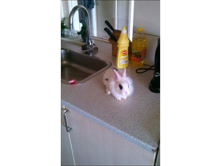 lille sød og kælen ikke særlig aktiv men kan godt være lidt men hun er en lille sød kanin