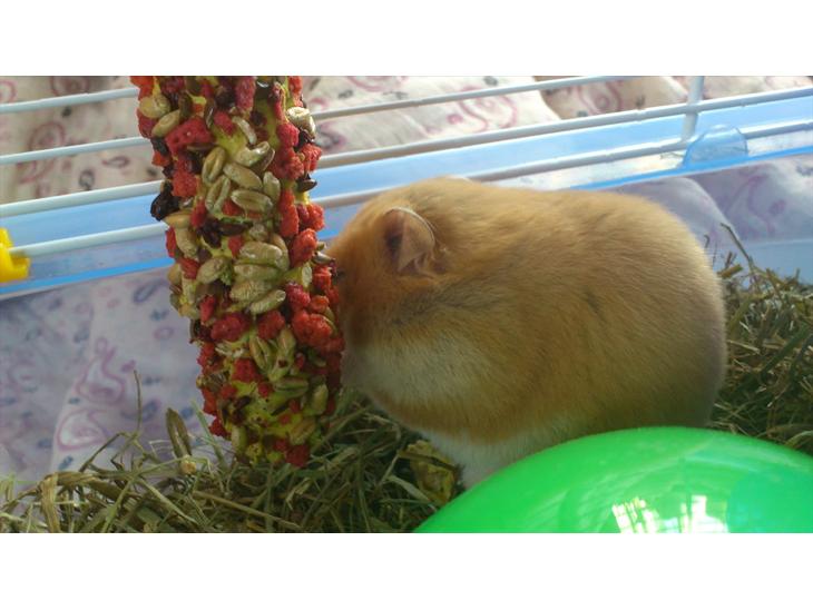 Han er et rigtig dejligt guldhamster meget nysgerrig og elsker at løbe i sin kugle.
