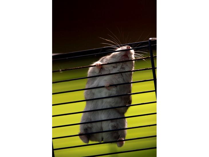 Fiser op og ned i sit rør og bruger sit hjul meget flittigt om natten. Og så kan han godt lide at gnave i sit hus og ommøblere rimelig tit!
