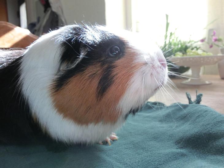 I hendes tidligere hjem var Party blevet kaldt "tyran" fordi hun jagtede rundt med de andre marsvin i buret. Vi købte hende med den bagtanke at Pjuske nok skulle kunne styre hende, da hans tidligere kone også var lidt af en madamme... vi lod dem snakke sammen, først i hver deres bur, dernæst ude på gulvet. Party hakkede med det samme på ham, og viste truende adfærd, men vores lille naive Pjuske var ikke sådan lige tilbøjelig til at give op. Han gik roligt hen og nussede hende på kinden, og blev ved til hun ikke hakkede på ham mere :) siden da har der aldrig været noget med hende - hun vil gerne bestemme, og hun bliver muggen hvis hun ikke får lov - men hun har ligesiden været sød og rolig, og på Pjuskes dødsleje nussede, slikkede og muttede hun til ham.