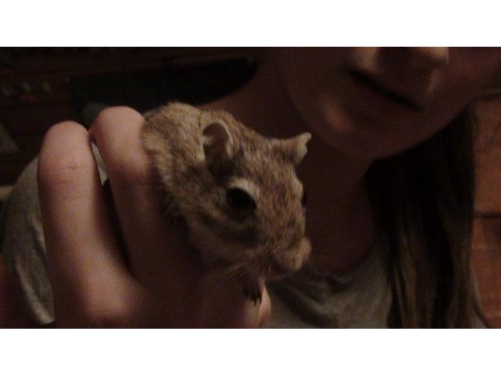 Han har tre ben, efter han kom op og slås med sin bror. Han er brun, og hvid på maven, med store sorte øjne. Han bor i et akvarium med masser af trælegetøj. Han elsker når jeg har renset hans bur, og lagt et stort lag savsmuld, som han kan grave store gange i.