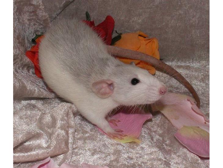 Han er en agouti berkshire husky dumbo, som har mistet rigtig meget af hans farve, så han nu næsten ligner en BEW, han har kun en smule brune hår, som indikere at han har været agouti engang :P