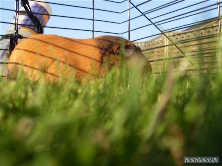 hun er rød/brun og hun har os lidt sort og hvide pletter og en sort og hvid vivel (staves) hun er meget tyk ;s og hun har en flad næse, hun elsker at kysse. hun har fået 15 unger i alt men 3 kul, men af alle de 15 unger var der kun 1 der overlevede desværre..