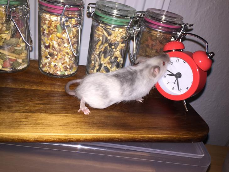 Han er rigtig kælen og forholdsvis rolig, nyder at være i hånden og ellers få lov at udforske tingene uden for buret
