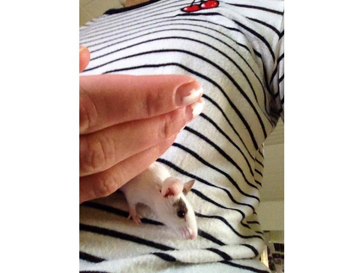 Dísa er en smuk lille mus. Hun er en korthåret mus og meget spinkel. Hun elsker opmærksomhed og hun elsker at kravle rundt på mig istedet for at løbe rundt på gulvet som de 2 andre jeg har foretrækker <3